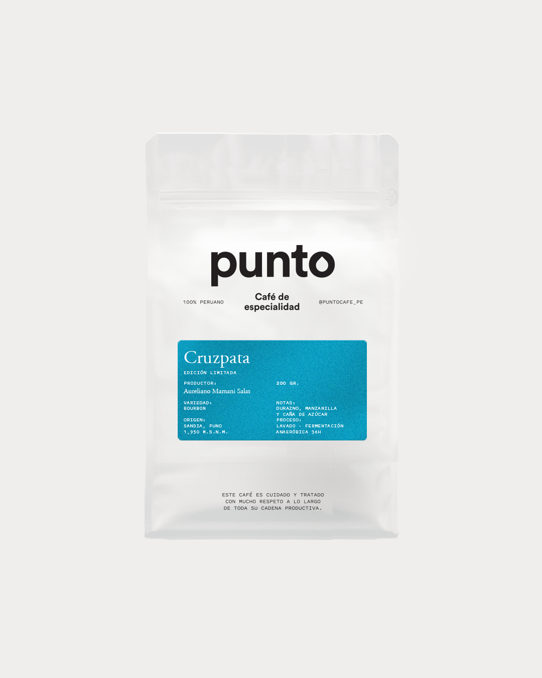 Variedad Bourbon producido por Aureliano Mamani Salas con origen en Sandia, Puno. Tostado en Lima por Punto, tiene un tueste medio con notas a durazno, manzanilla y caña de azúcar.
